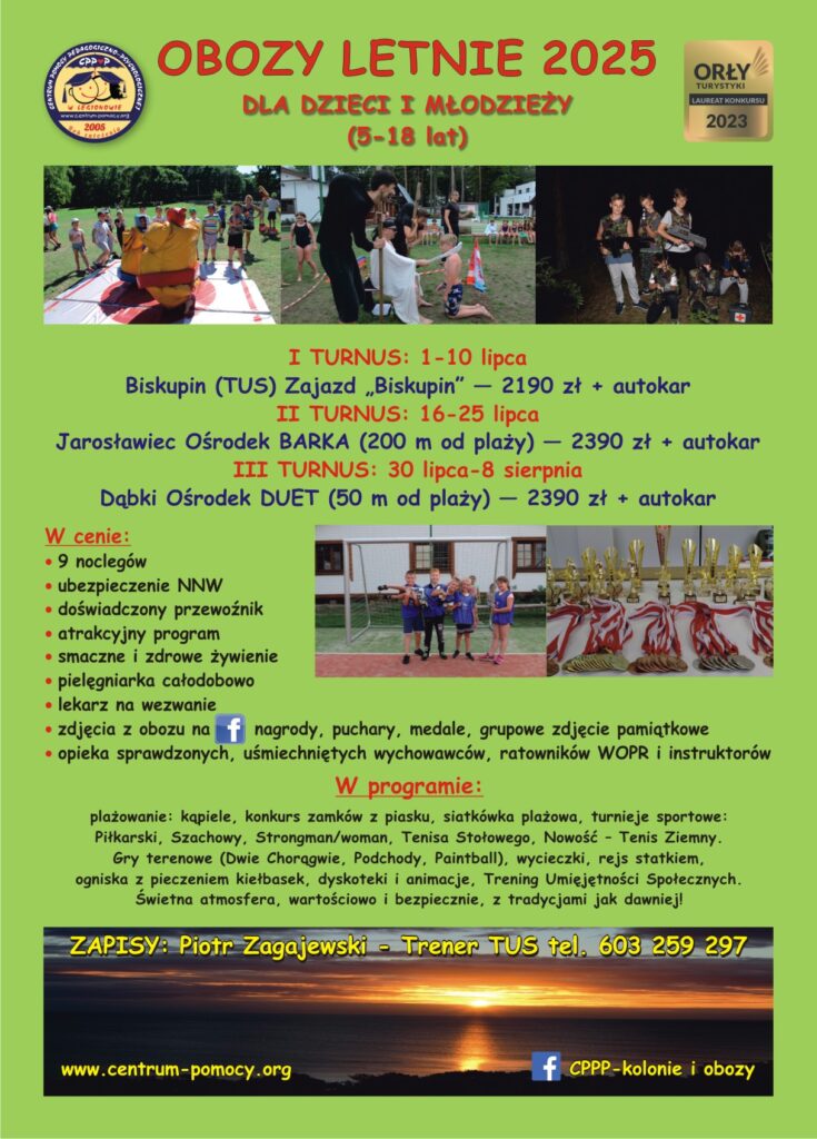 Bardzo polecam wyjazdy na Obozy z P. Piotrem. Osobiście mam porównanie jak są zorganizowane kolonie i obozy przez innych organizatorów, dlatego polecam CPPP- kolonie i obozy i dlatego też to nasz wybór. Jeździmy z P. Piotrem już od 4 lat. Atmosfera jaka panuje na obozach jest bardzo pozytywna . Dzieci i młodzież sama zapomina o komórkach, nie mają zwyczajnie czasu i chęci na spędzanie czasu przed ekranem Jeżeli ktoś pamięta własne dzieciństwo, trzepak, grę w zbijaka itd to wie, jak fantastycznie spędzał czas w gronie kolegów, koleżanek i tutaj dzieci mają możliwość posmakowania tej atmosfery (...) Jeździmy z CPPP- kolonie & obozy dlatego też, polecamy z całego serducha. Magdalena Agnieszka
