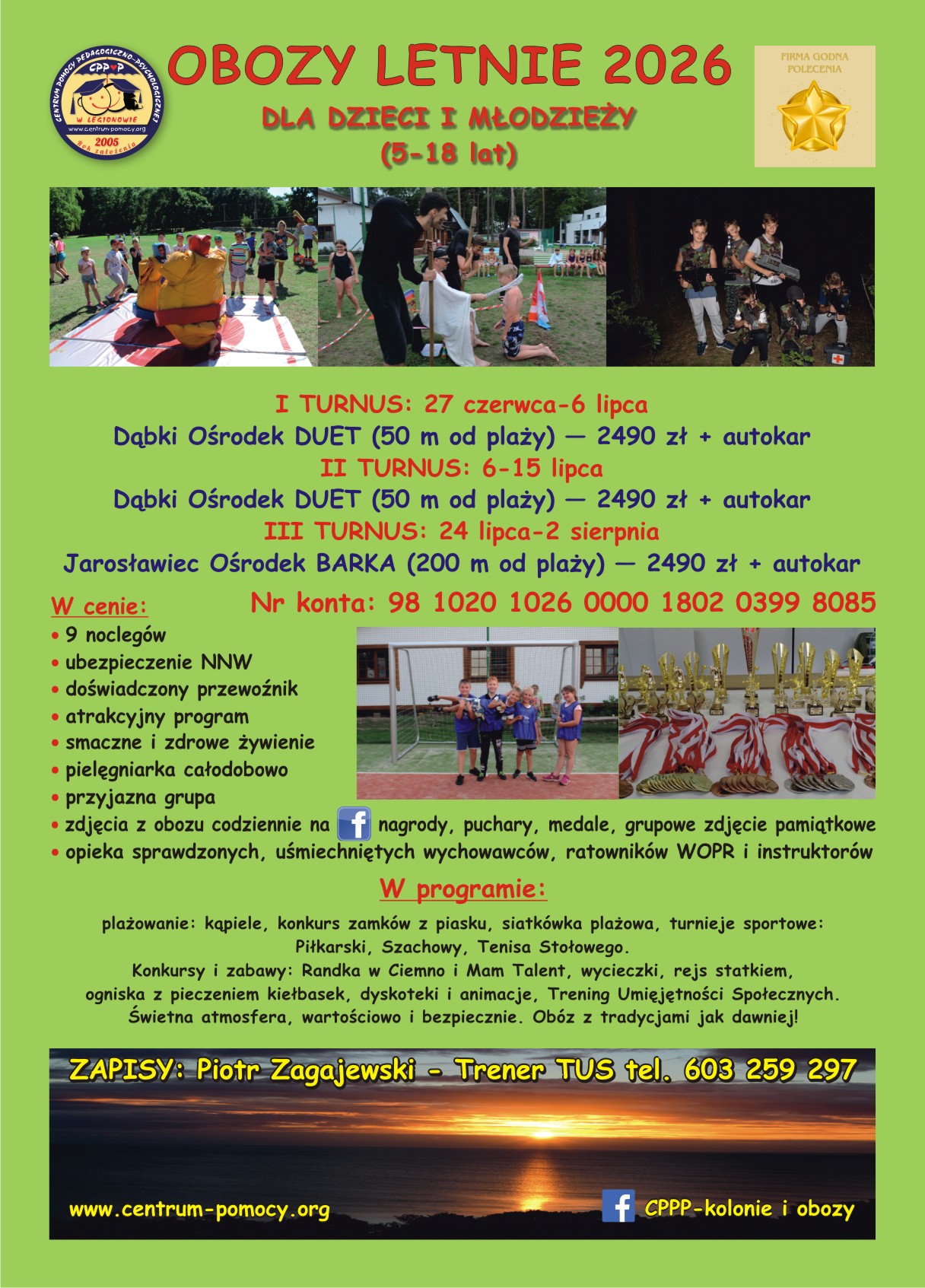 • 📞 Szczegółowe informacje: tel. 603 259 297 (Piotr Zagajewski – Kierownik Obozów)